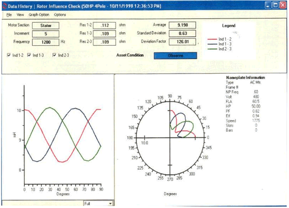 • Influência do rotor (RIC): Teste de diagnóstico onde se grafica a indutância mutua entre o rotor e o estator em função do ângulo do rotor que confirma a presença de falha no estator, barras quebradas ou fissuradas e excentricidade no entreferro. Usa-se atualmente para substituir o surge tester.